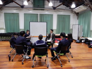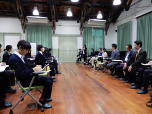 始めに「分科会」として、法曹界の方2~3名ずつと、生徒4,5名に分かれて、分科会を行いました。「弁護士になるにはどうすればいいか」「どんな学生時代を過ごしたか」など、様々な質問が飛び交いました。少人数ということもあって、知りたいことを十分聞くことができ、時間が足りないくらいでした。