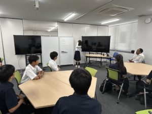 について講義を受けました。「Hamburger Model」や「OREO」といった論理的に表現する方法を学びました。英語でのプレゼンテーションにやや苦戦する生徒も見られましたが意欲的に取り組むことができました。